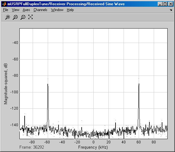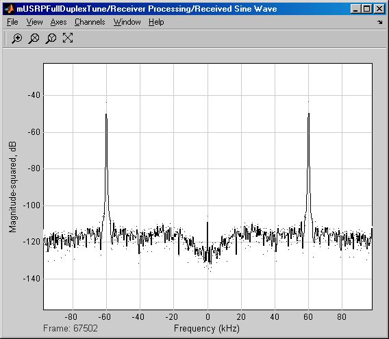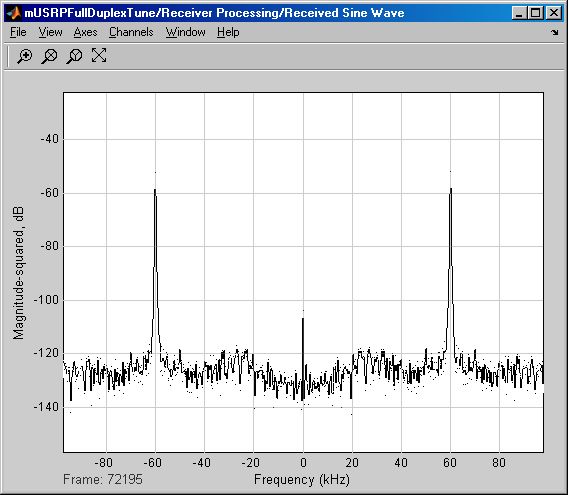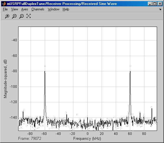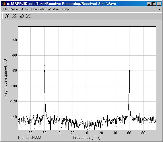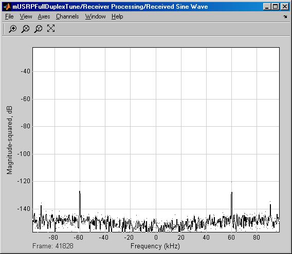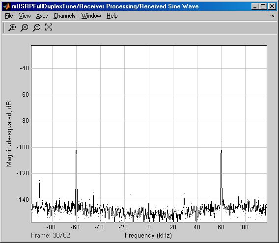 The model and hardware configuration described above allows me to set fc and the attenuation in the RF path. However, the behaviour of the output (Rx) spectrum is not quite as I would have expected--instead of the amplitude of the peak changing when the RF attenuator is adjusted, it appears that the level of what could be called the noise floor of the output changes instead. Could this be due to a numerical effect in the Simulink FFT block that holds the "peak" but instead changes the "floor"? Or has it something to do with the Ettus radio--perhaps the result of some automatic gain control (AGC) circuitry?